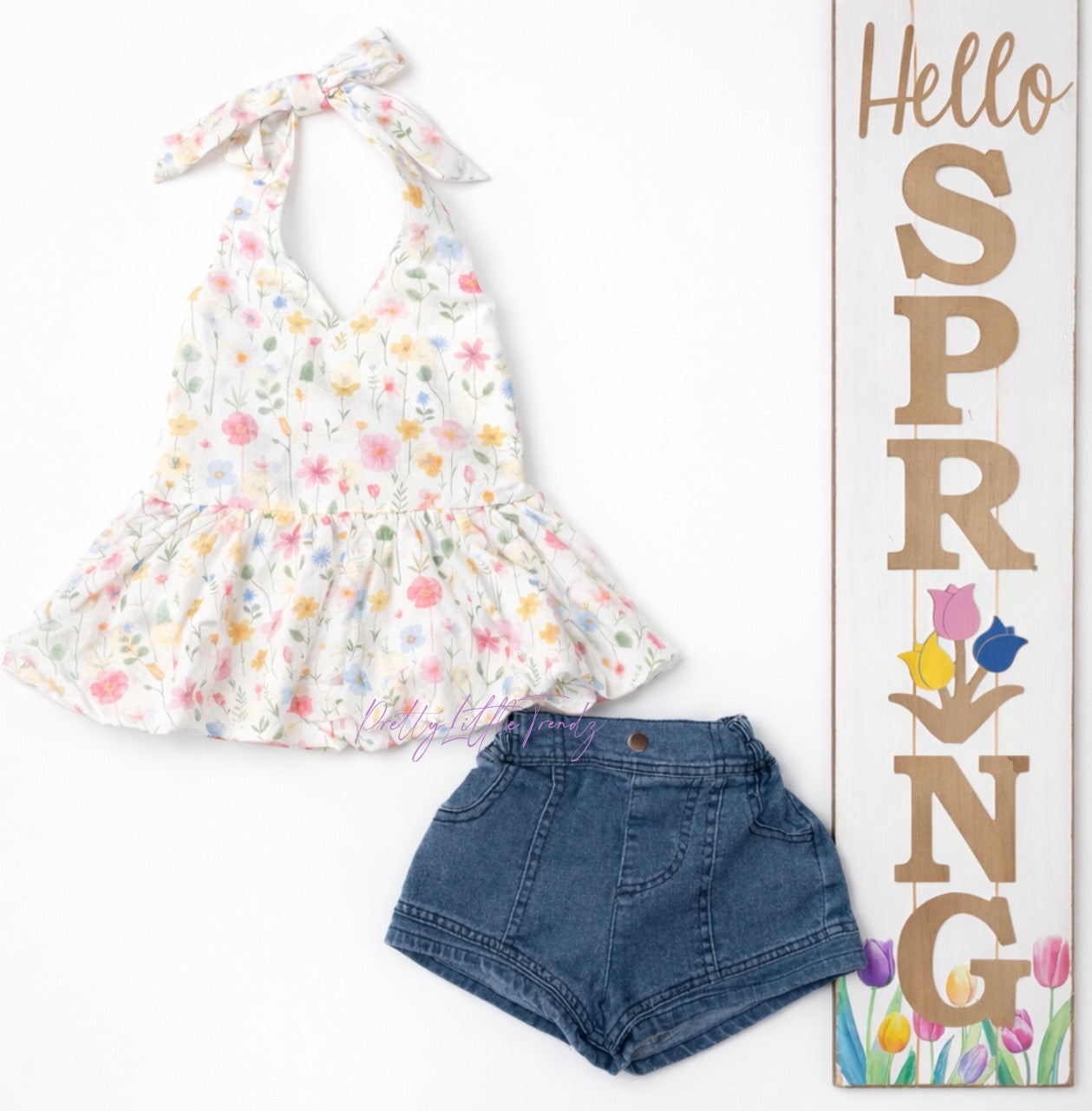 Sweet, stylish, and full of charm 🌸 This two-piece set features a floral halter top with a flowy ruffle hem and a beautifully smocked back with an adjustable bow for the perfect fit. Paired with classic denim shorts, it’s the perfect mix of girly and everyday cute.