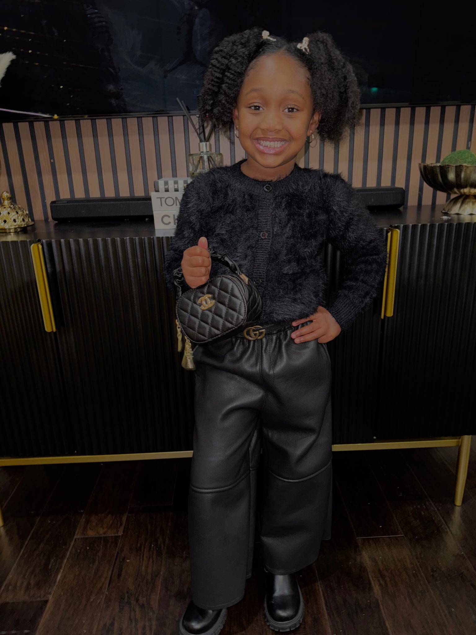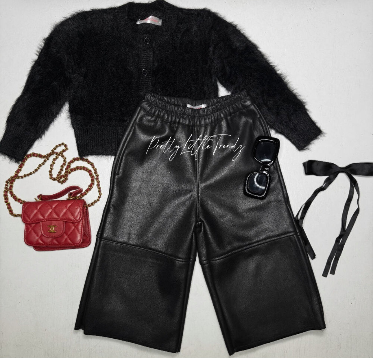 The ultimate cool-girl look with this soft black fur cardigan paired with wide-leg faux leather pants. Cozy on top, edgy on the bottom—perfect for holiday outings, photos, or everyday style with attitude. Runs true to size.